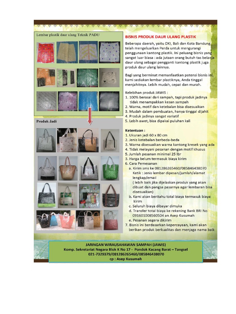 Dari sekian banyak sampah plastik tersebut bisa anda daur ulang hingga menjadi aneka tas cantik dan bernilai ekonomis tinggi. Maka modal yang diperlukan untuk membeli bahan limbah plastik adalah 1000 x rp.5000= 5.000.000. Mas ian, saya ingin memulai bisnis pengolahan plastik.