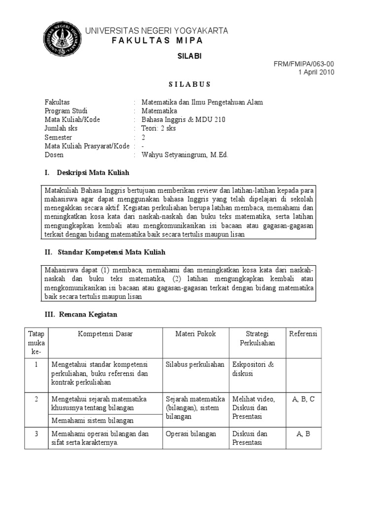 Silabus Mata Kuliah Bahasa Inggris Perguruan Tinggi