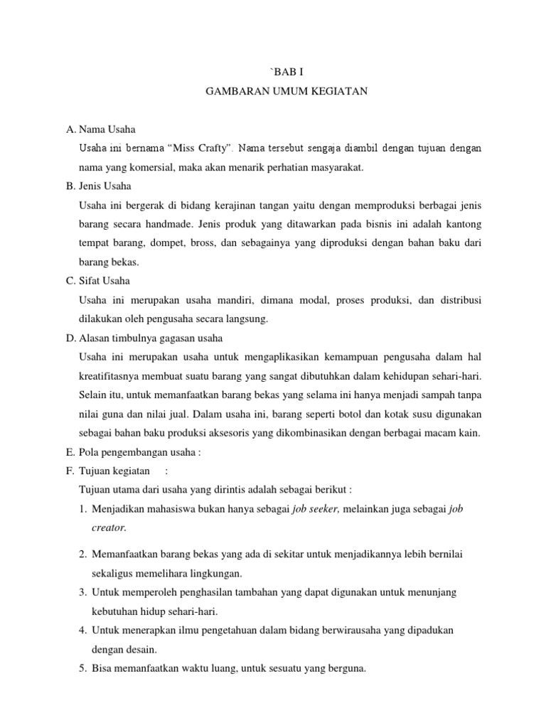 Oleh sebab itu, pada ulasan kali ini akan dibahas mengenai proposal untuk merencanakan sebuah bisnis. 10.13140/rg.2.2.32169.34404 citations 0 reads 18,994 2 authors , including: Adapun tujuan proposal ini yaitu untuk memperkenalkan lebih detail tentang produk saya dan mengundang para investor untuk bekerja sama membangun usaha kerajinan sandal unik ini.